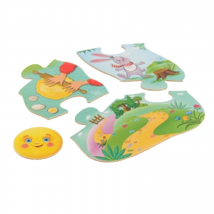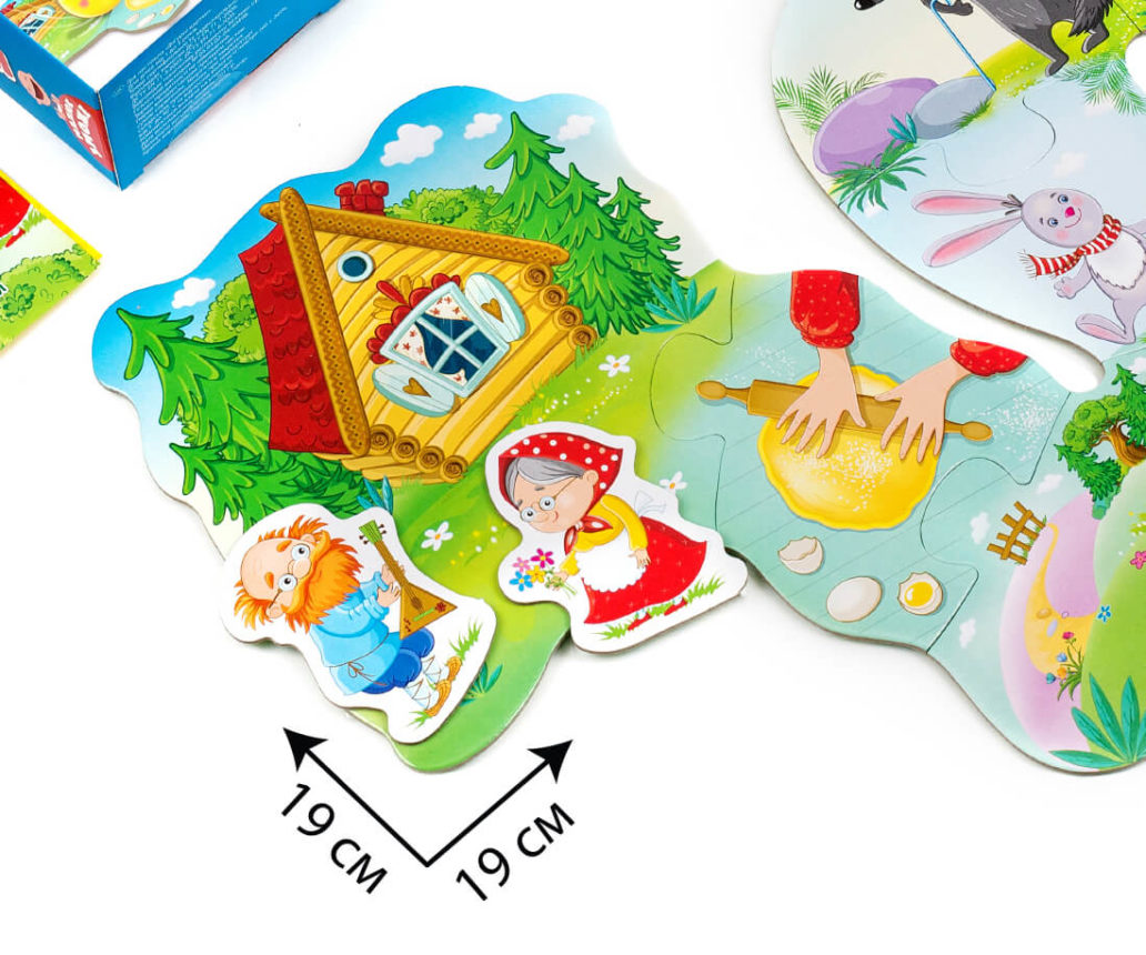 Комплект: 8 деталей пазла, 3 картонных фигурки, сказка.
