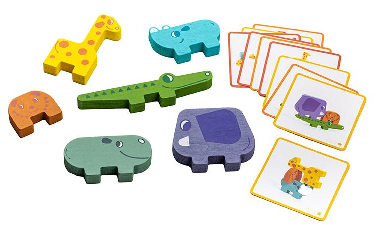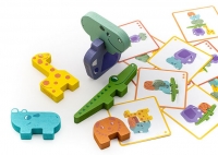 В комплекте: 20 карточек с заданиями разного уровня сложности, 6 деревянных фигурок животных для строительства разных пирамидок