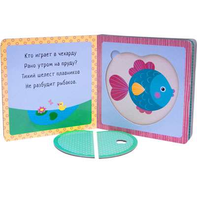 Внутри ваш малыш найдет четыре веселых загадки в стихах, а, вынув пазлы, найдет отгадку, кто прячется под зонтиком, за забором и т. д. С каждым разворотом узнать отгадку сложнее – количество пазлов, скрывающих картинку, увеличивается.