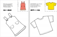 Раскраска "Летняя одежда" содержит изображения: платье, шорты, юбка, сарафан, футболка, панама, кепка, сандалии.