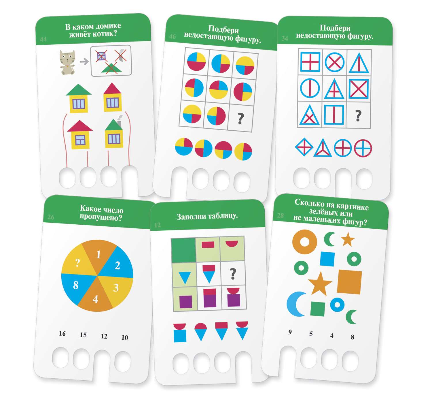Первая игра с карточками построена по типу теста. Ребёнок будет подбирать фигуры, продолжать последовательности, определять закономерности и решать другие логические головоломки. Выбрав подходящий вариант ответа, нужно вставить карандаш в отверстие под ним. Если ответ правильный, то карточка легко вынимается из блока. Если ребёнок выбрал неверный вариант ответа, он не сможет вытянуть карточку и перейти к следующему заданию.