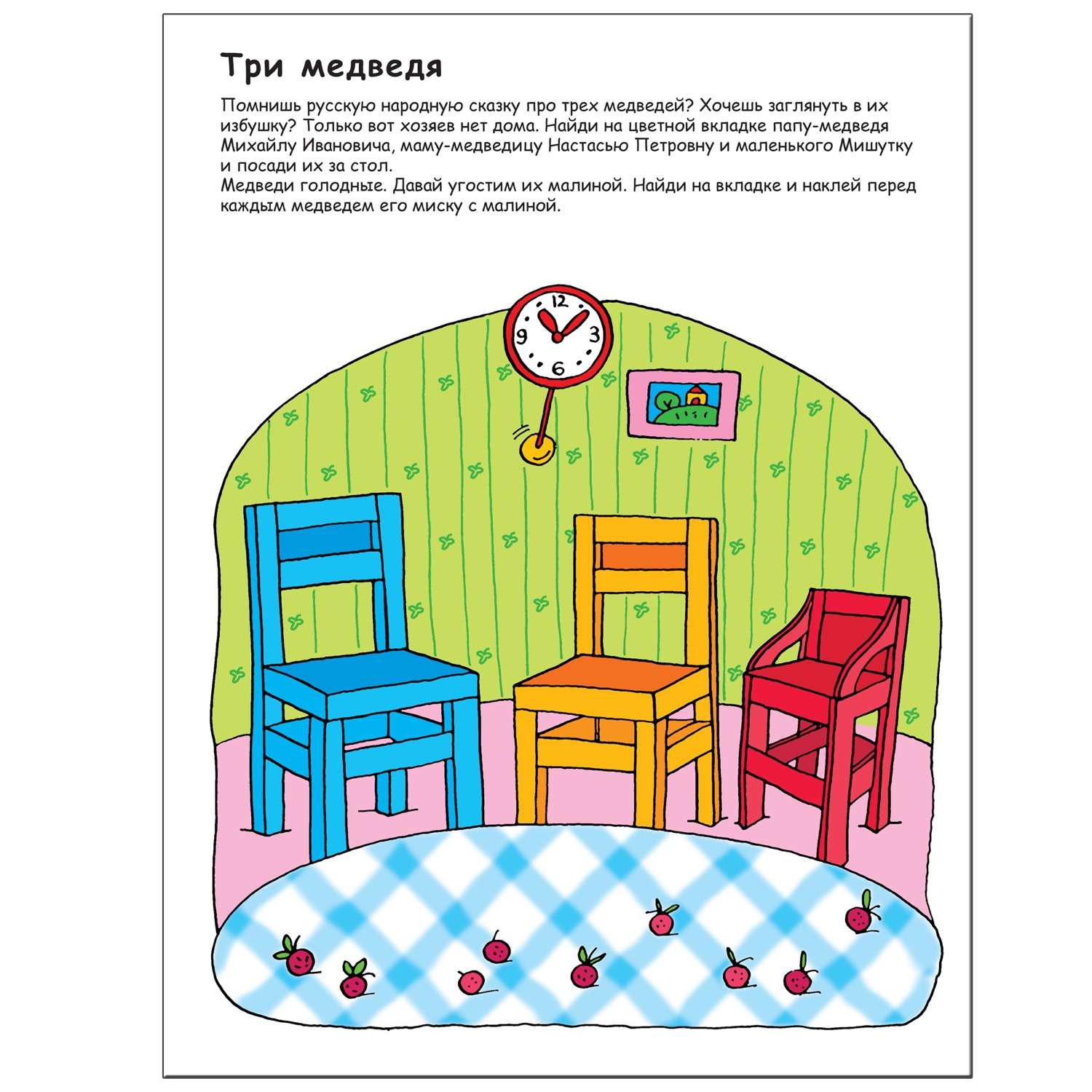 Здесь кроха встретит своих любимых героев и поможет каждому из них найти дорогу в правильную сказку: трех медведей поместит в избушку, отправит домой обитателей теремка и так далее.