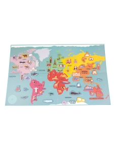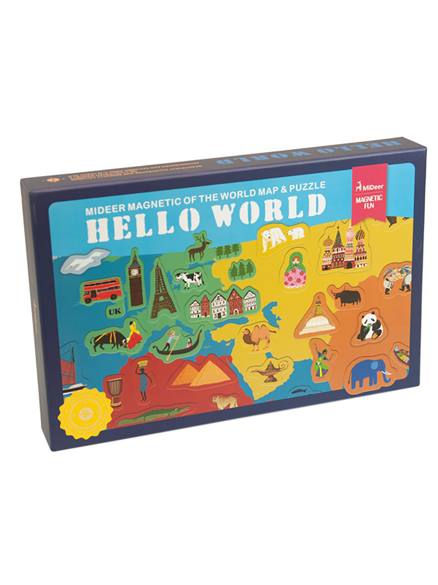 Магнитный пазл “Привет мир” состоит из большой карты-основы с нанесенными материками, океанами и морями и набора магнитов-пазлов 148 шт. с изображением достопримечательностей и памятников архитектуры, особенностей отдельных стран, растений, животных и птиц, обитающих на континентах. Магниты изготовлены из плотного ламинированного картона. Игра отлично подойдет для первого знакомства ребенка с этим удивительным миром, она развивает память, познавательные способности, воображение, внимание, логичеcкое мышление. Играть с картой будет интересно и вам и вашему ребенку, замечательный повод повторить забытое и узнать новое. На магнитах вы сможете найти достопримечательности и памятники культуры, архитектурные сооружения, национальные костюмы, животных и птиц, обитателей морей и океанов, и многое другое. Если вы не сможете объяснить ребенку к примеру изображенный на магните памятник архитектуры, то вам в помощь есть красочная инструкция, с интереснейшими фактами, которую вы найдете в коробке.