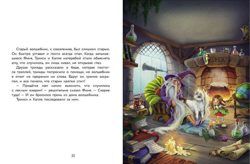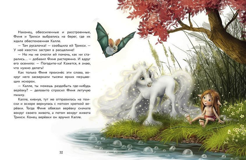 А вы знаете, что все единороги могут исполнять желания? Ну то есть почти все. Маленькому единорогу по имени Финя это пока не слишком хорошо удаётся. Зато у него есть верные друзья: летучая мышка Калле и девочка-эльф Трикси. Вместе им любое дело по плечу, и они всегда готовы прийти на помощь. В этот раз нужно срочно узнать, что случилось с лесным озером, воды которого затопили деревню троллей. Волшебство здесь бессильно. Значит, Финя, Трикси и Калле обойдутся без волшебства...