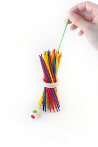 Игроки поочередно бросают кубик и достают по одной палочке из «шалашика» в соответствии с выпавшим цветом на грани кубика.