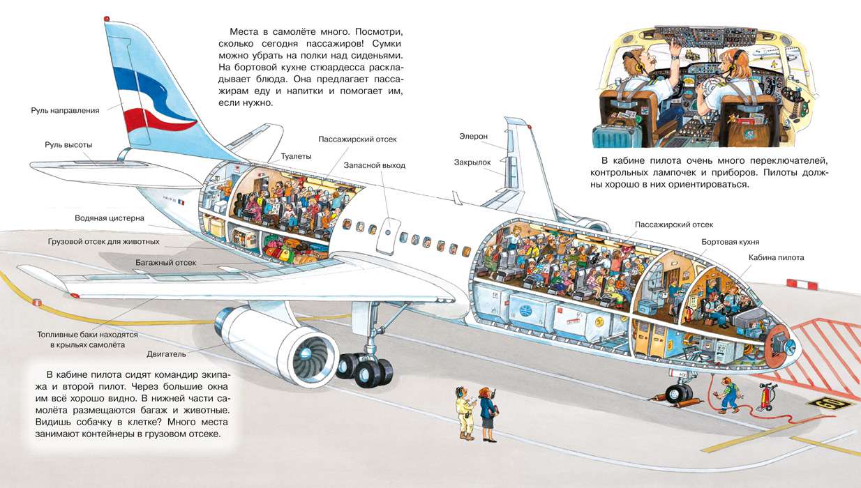 На каждом книжном развороте внимание Вашего малыша привлекут красочные сюжетные изображения множества различных ситуаций, связанных с полётом на самолёте. Они расскажут об устройстве аэропорта, аэровокзала и самого воздушного лайнера, о разных видах авиационных профессий, о правилах поведения во время полёта и, конечно же, о самом путешествии.