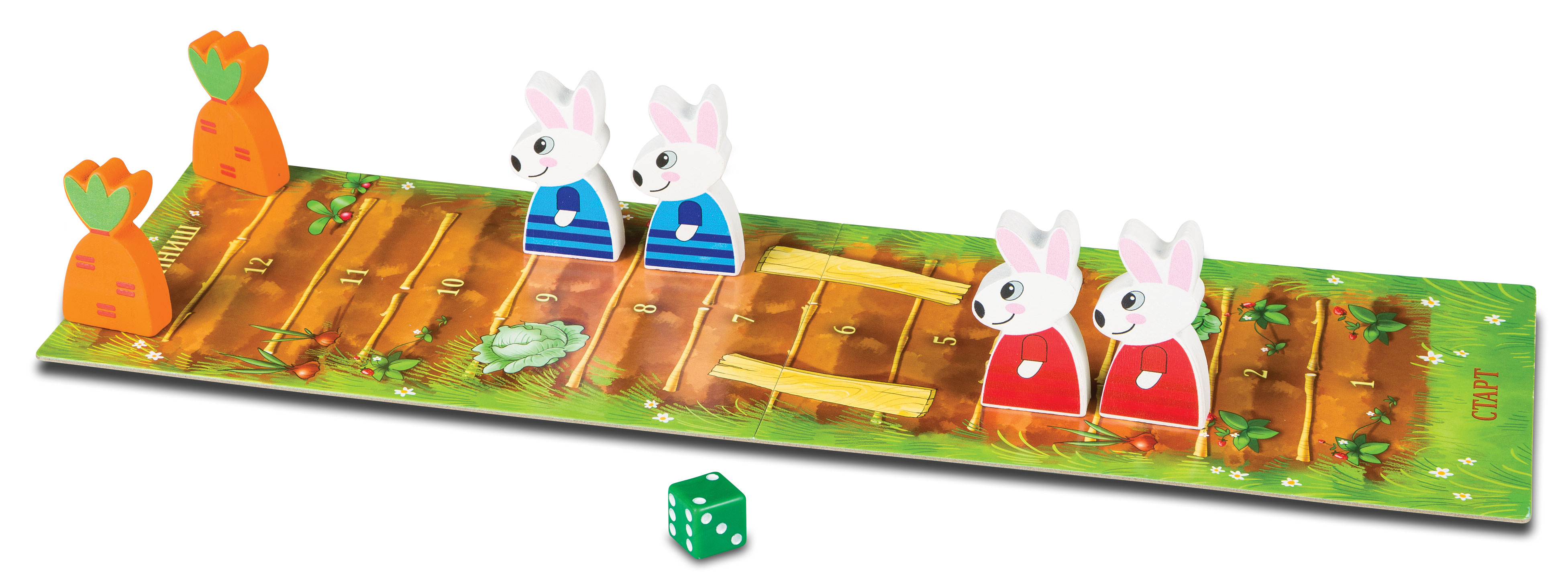 Выигрывает игрок, кролик которого первым доставит морковь на старт второму кролику.
