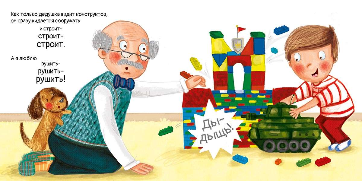 Всё-таки странные это люди — дедушки. Им нравятся абсолютно неправильные вещи: не кататься на качелях, а качать их, не прятаться, а водить, не разбирать, а строить… Они никуда не торопятся — и как им только удаётся сдерживаться! — ведь хочется добежать и дотронуться буквально до всего, что видишь! В общем, дедули — совершенно непонятный для нас, внуков, народ. Но хоть мы и смотрим на мир совсем по-разному, есть одна вещь, которую мы видим одинаково, — мы друг для друга самые дорогие люди!