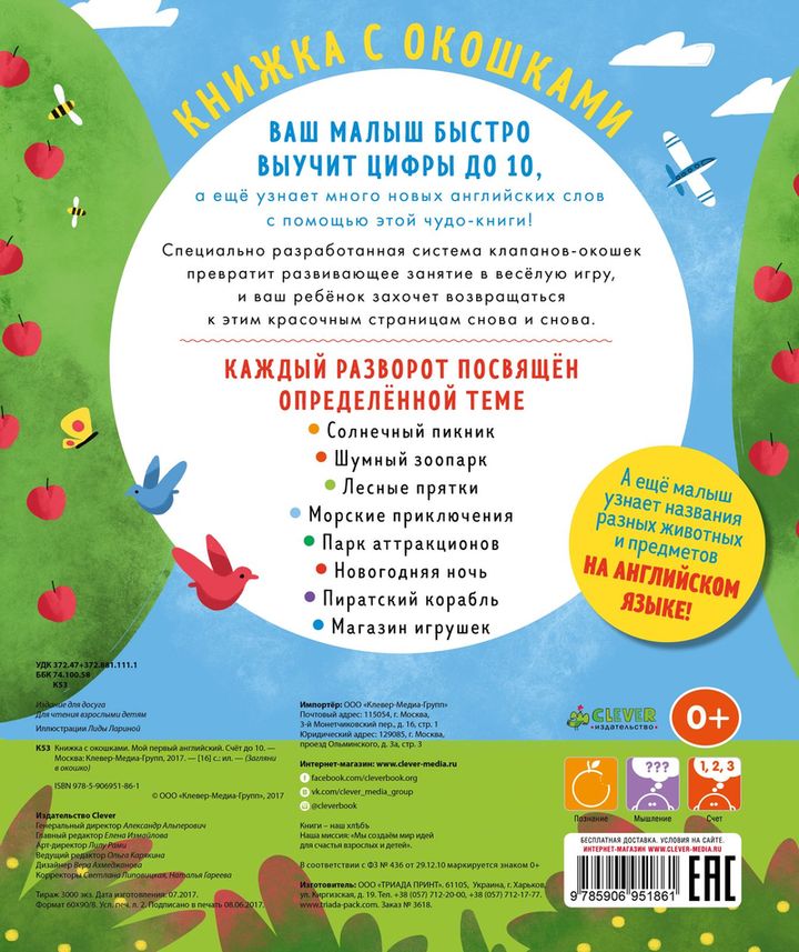 Учите английский легко и весело! Ребёнок с удовольствием будет рассматривать яркие картинки и учить новые слова и счет до 10 сразу на двух языках — русском и английском. Специально разработанная система клапанов-окошек превратит занятие в веселую игру, и ваш ребенок захочет возвращаться к этим красочным страницам снова и снова.