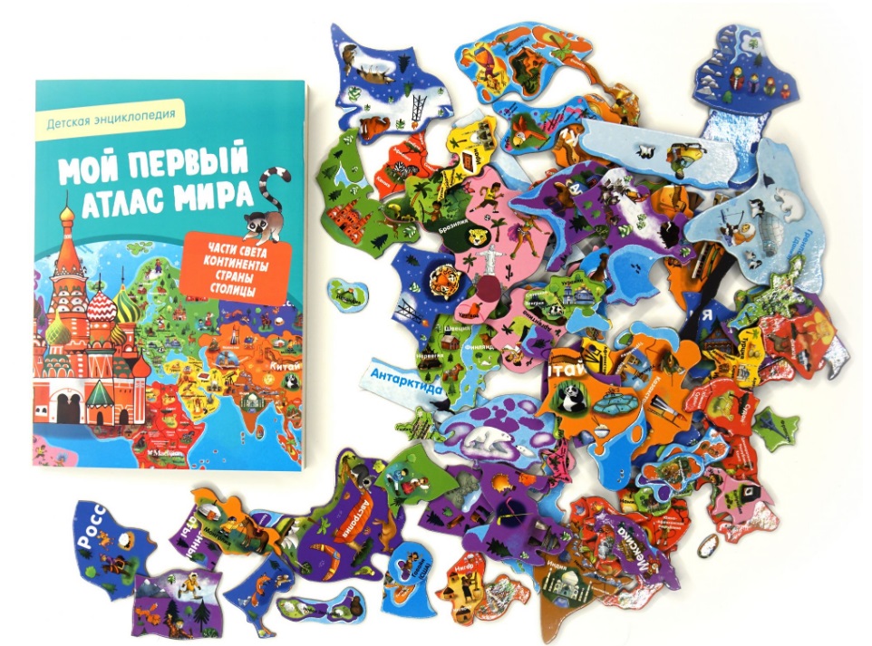 Cобери карту мира с помощью 81 магнита. Обращай внимание на цвет магнита – он должен совпадать с цветом на карте. Новых открытий!