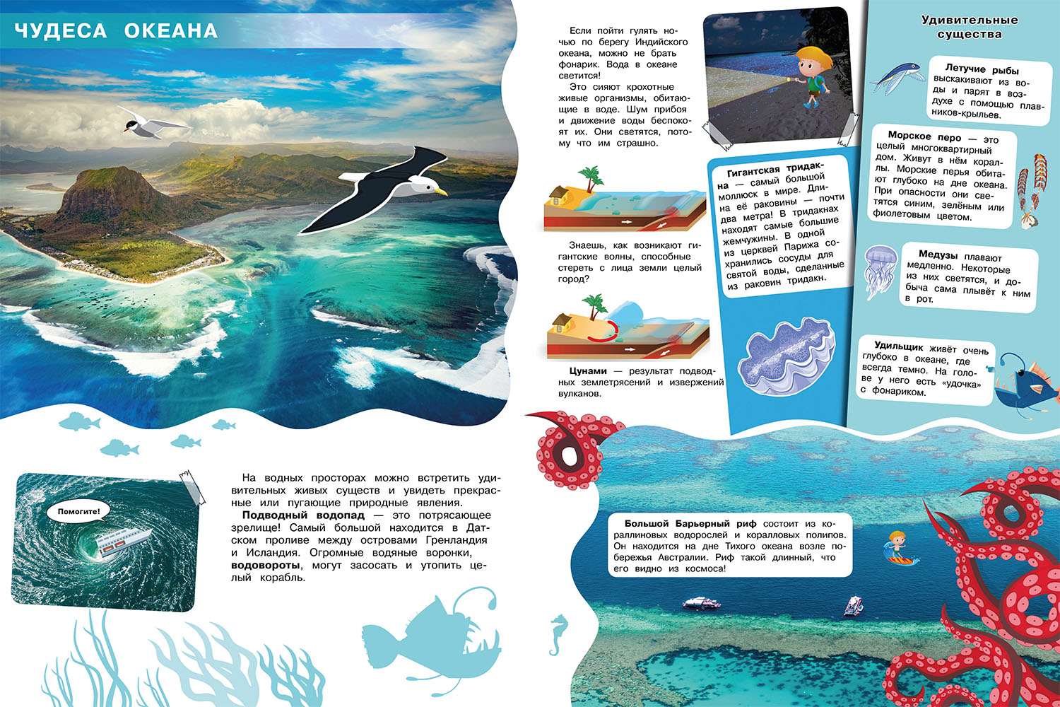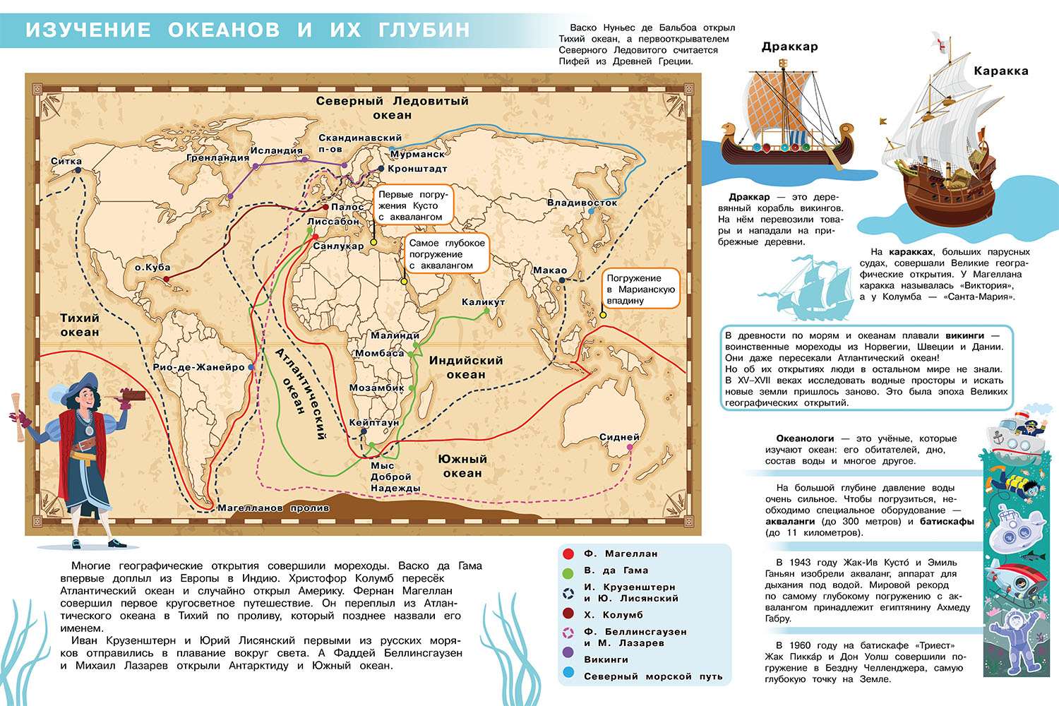 Атлас можно использовать в качестве оригинального учебного пособия для детей младшего школьного возраста, которое в игровой и занимательной форме расскажет Вашему ребёнку много интересного об океанском дне и богатствах, которые оно скрывает, познакомит его с морскими обитателями и удивительными морскими легендами.