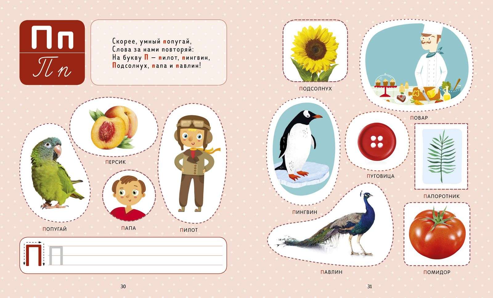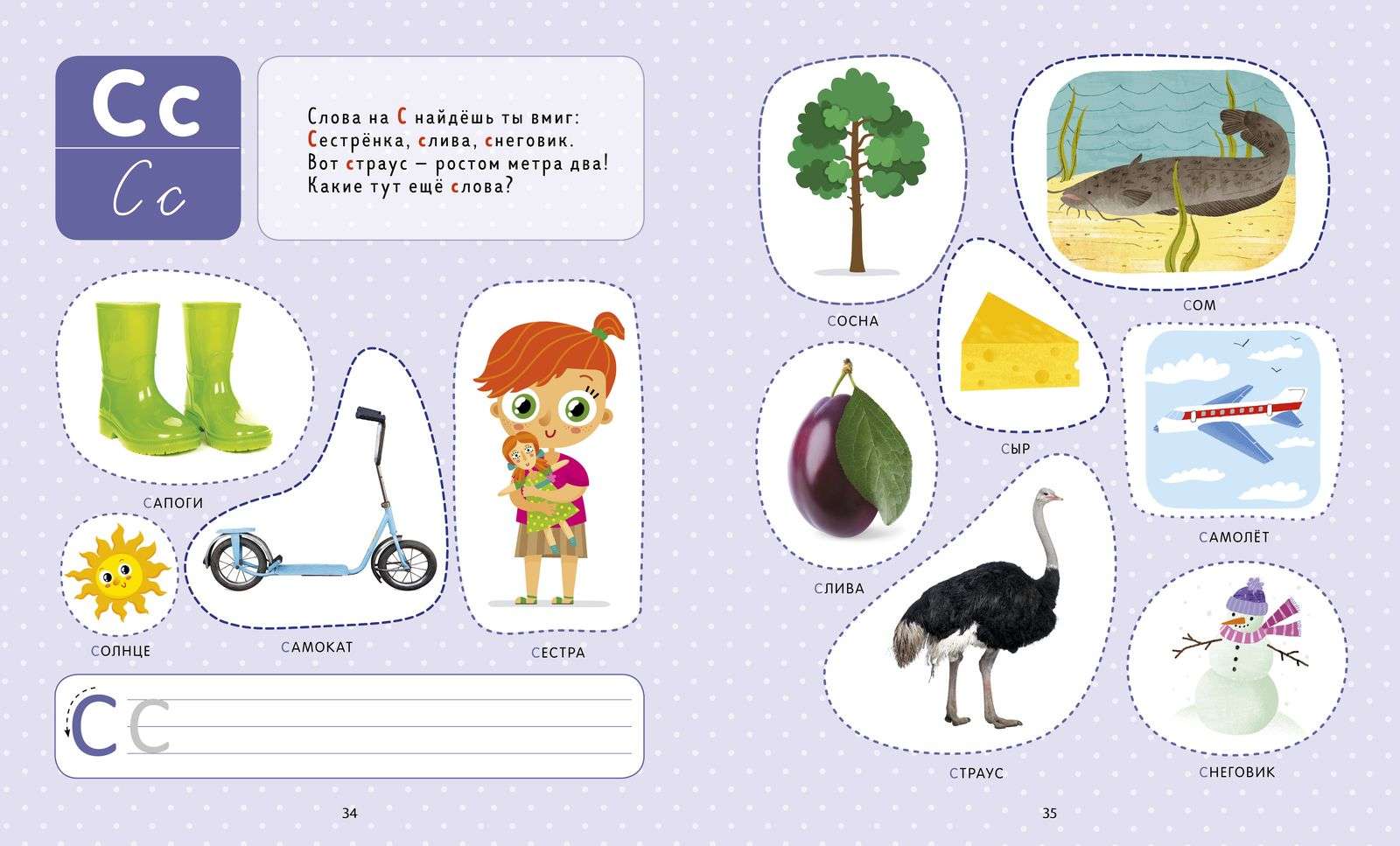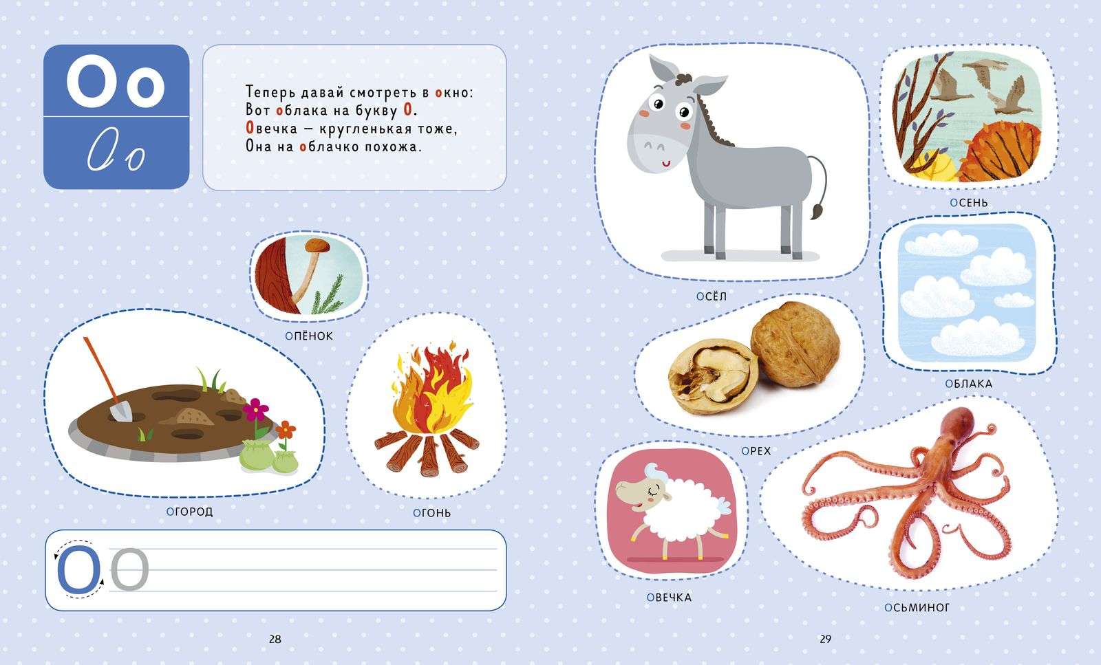 На каждой страничке — задания на знакомство с буквами. Букву ребенок научится отличать от других, правильно произносить и, наконец, писать.