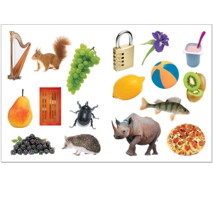 На каждую букву отведена отдельная страница с красочными фотографиями и подписями к ним. При этом одной картинки не хватает, ребенку предстоит найти ее среди наклеек и приклеить на нужное место.