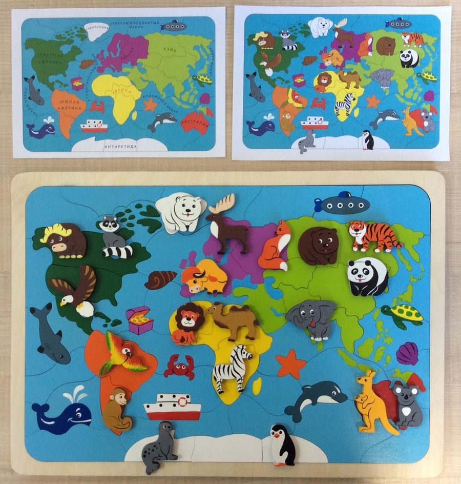 Карта мира - это двухуровневая красочная мозаика для детей дошкольного возраста. Большое поле (формат двух альбомных листов) собирается из 62 элементов. Мозаика дополнена 20 фигурками. В помощь ребенку и родителям в комплект вложены 2 цветных вкладыша. На одном указаны названия материков и океанов, на втором - места обитания животных, млекопитающих и птиц.