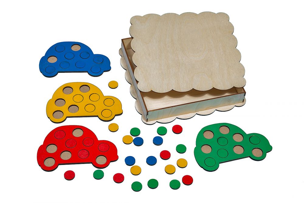 1. Сортируйте кружочки по цветам и вкладывайте в машинки соответствующего цвета;