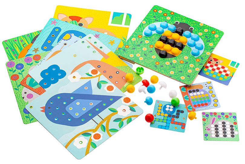 В комплекте: деревянная основа, карточки с заданиями (8 шт), пластиковые детали мозаики (120 шт).