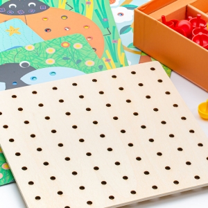 - Элементы имеют оптимальный размер, поэтому ребенку удобно брать их ручками и вставлять в отверстия на деревянной основе.