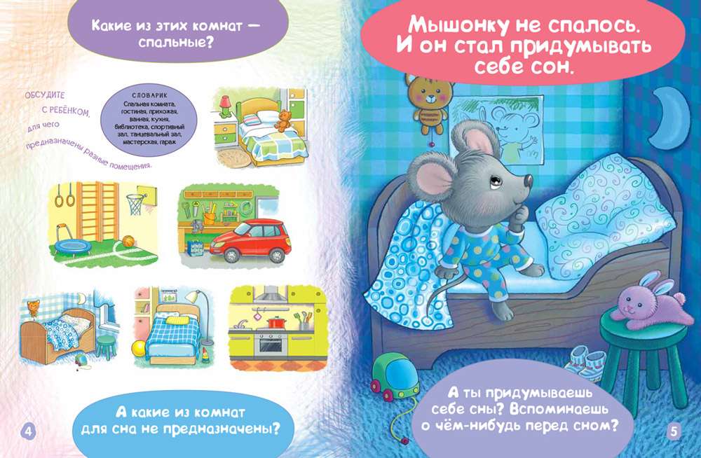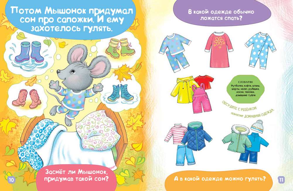 Простой и понятный сюжет — одевание, помощь по дому, рисование, сон — заинтересует малыша, а вопросы и темы для обсуждения построены так, чтобы ребёнок учился анализировать то, что происходит с героями книги, и делать собственные выводы. При этом важно, что часть вопросов относится к реалиям жизни самого маленького читателя: какие сапожки он носит, что видно из его окна, какая погода сейчас на улице. Для удобства взрослых на каждой странице приведён небольшой словарик в 10—12 новых для малыша слов.