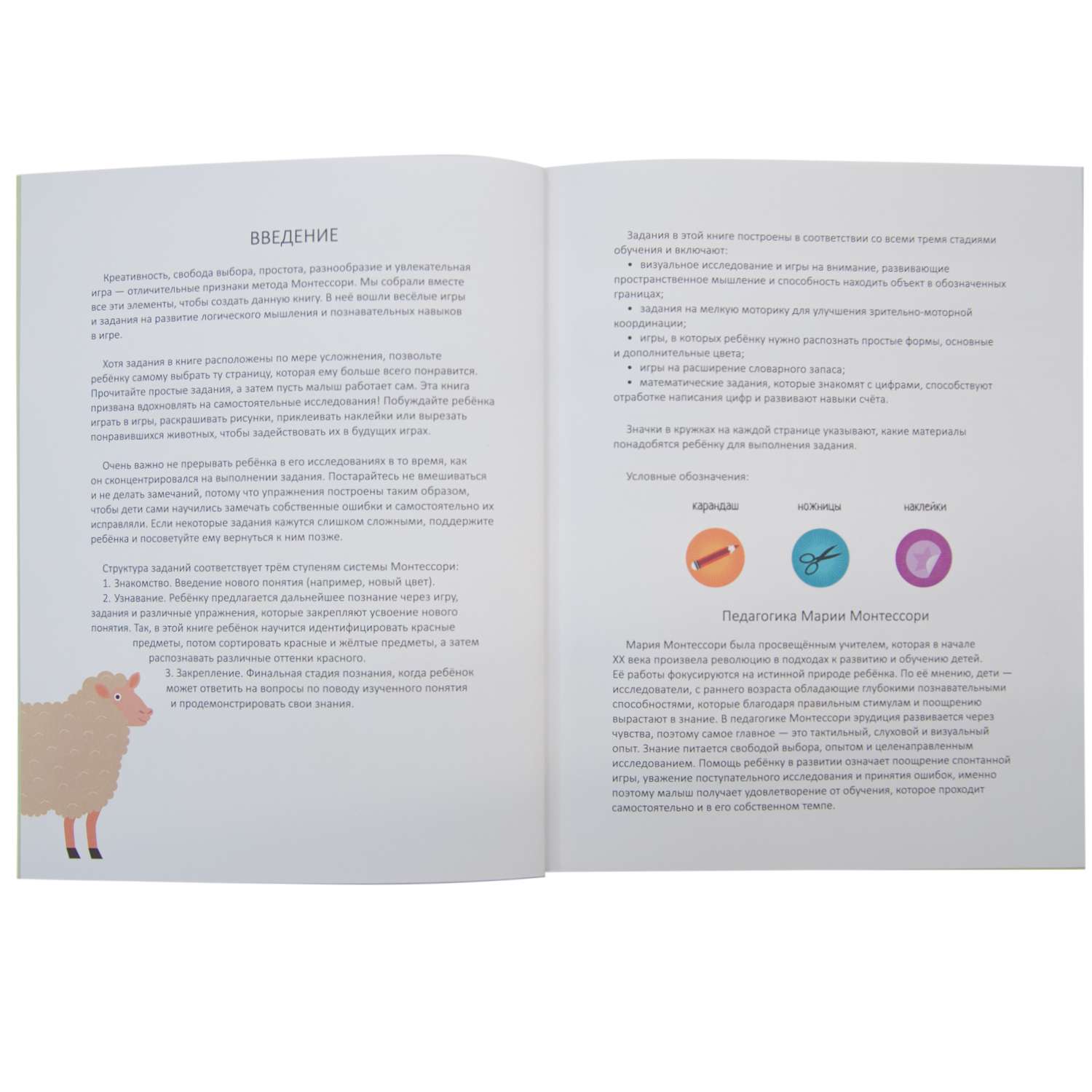 В книге ребенка ждет множество разнообразных заданий, в основу которых положены основные принципы метода Монтессори: креативность, свобода выбора, простота и увлекательность игры. Распределяя по страницам наклейки, дорисовывая и раскрашивая картинки, решая интересные задачи и головоломки, ребенок познакомится с окружающим миром, освоит навыки счета, научится различать оттенки цветов и ориентироваться в пространстве.