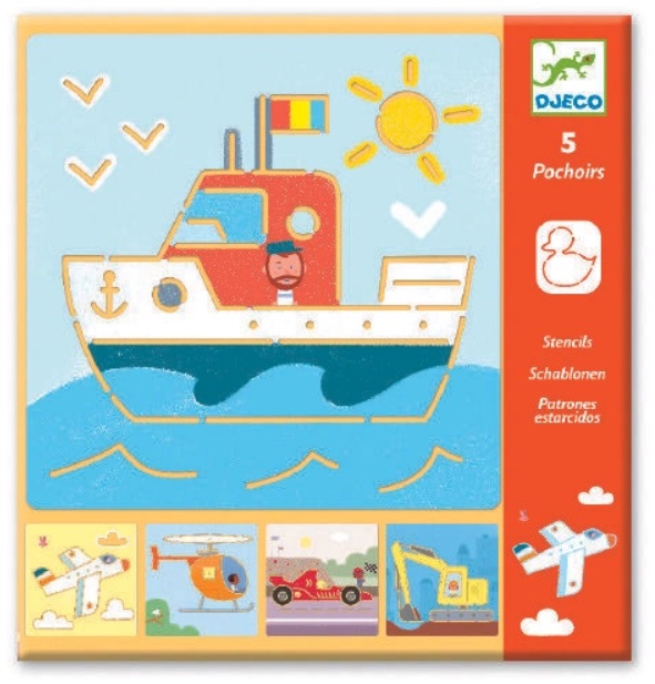 Набор для трафаретов Транспорт от французского производителя Djeco состоит из пяти трафаретов с изображением разных транспортных средств - вертолета, экскаватора, самолета, корабля и гоночной машины.