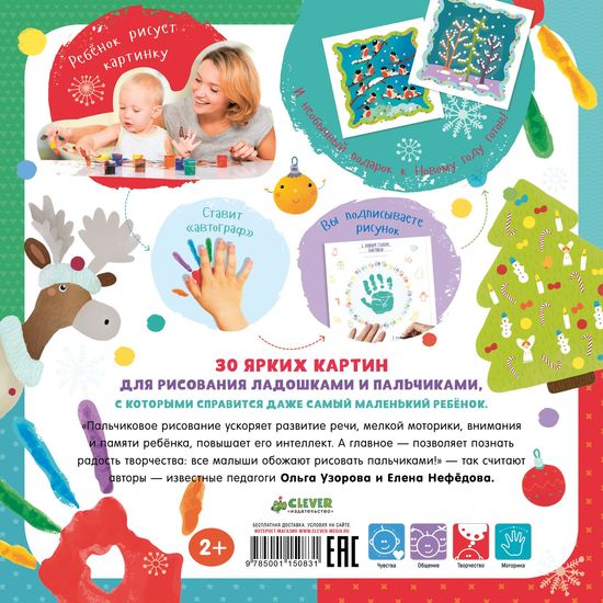 Книга «Нарисуй и подари на Новый год! Рисуем пальчиками и ладошками с 2-3 лет» создана известным методистом и автором знаменитых развивающих пособий Ольгой Узоровой. Издание развивает важные навыки и — что самое приятное — позволяет основательно подготовиться к Новому году! С помощью этой книги подарки для родных смогут сделать даже самые маленькие читатели.
