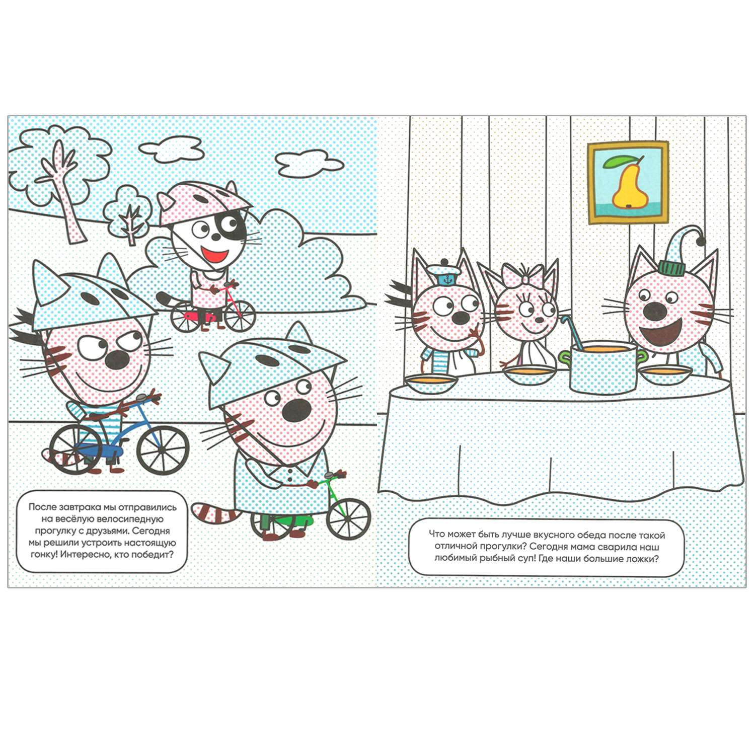 Забавные иллюстрации с героями любимого мультсериала расскажут маленькому художнику об одном дне из жизни Компота, Коржика и Карамельки.