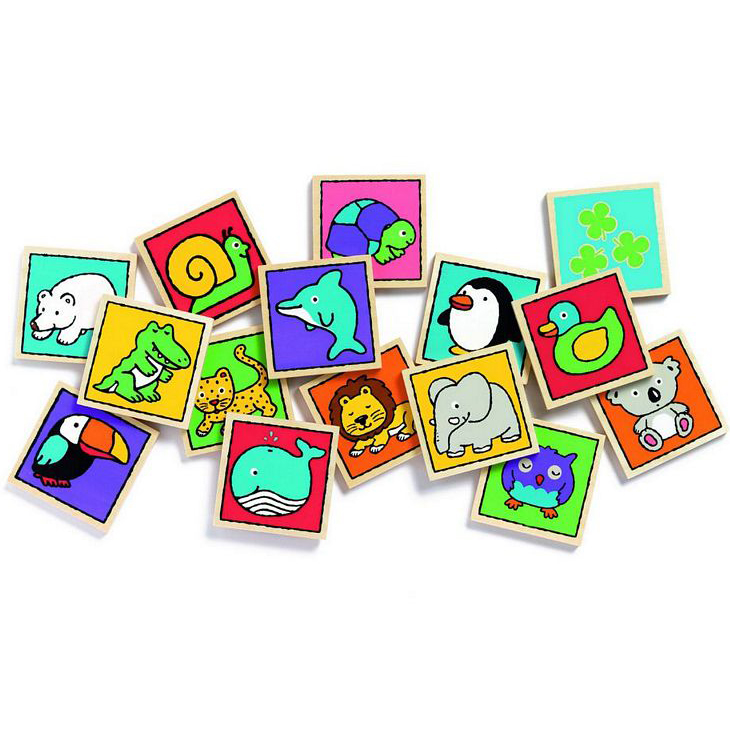 В комплект входит 32 деревянные карточки размером 5,6*5,6 см с парными изображениями забавных животных, птиц, морских обитателей, насекомых. Правила игры просты: все карточки перемешиваются и переворачиваются картинкой вниз, затем первый игрок должен перевернуть 2 из них, если ему удалось найти одинаковые изображения, игрок забирает себе эти карточки, если нет, то карточки остаются на столе. Победитель тот, кто собрал больше всех карточек.