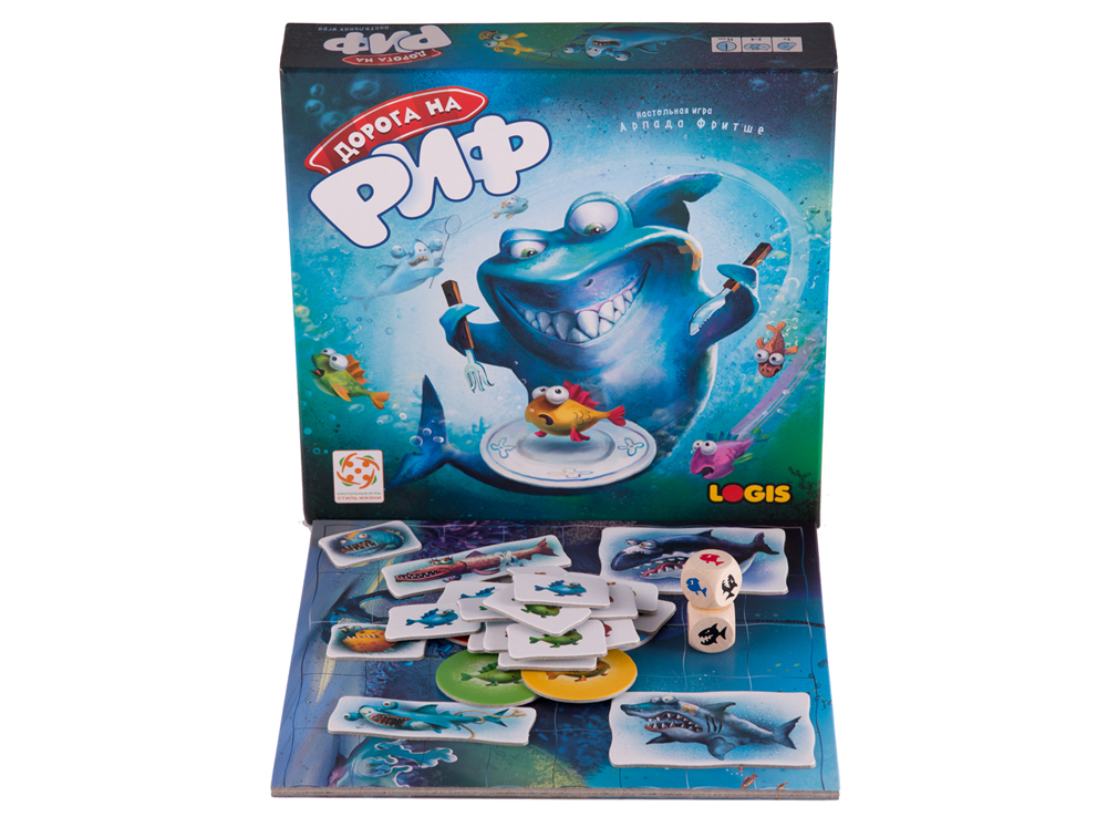 В состав настольной игры Дорога на риф входят: игровое поле, 2 деревянных кубика, 6 хищных рыб, 16 рыбёшек четырёх различных цветов, правила.