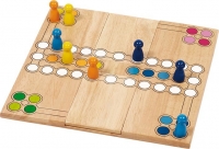 Цель - завести свои фишки в дом бестрее всех. Деревянное поле состоит из нескольких частей. Если убрать одну или две вставки, то получится игровое поле для игры вдвоём или втроём. И, о чудо, внутри коробки книжечка с правилами теперь и на русском языке!