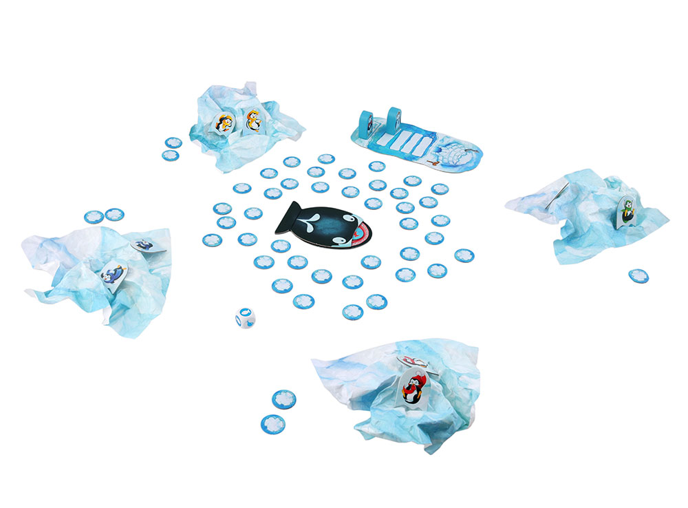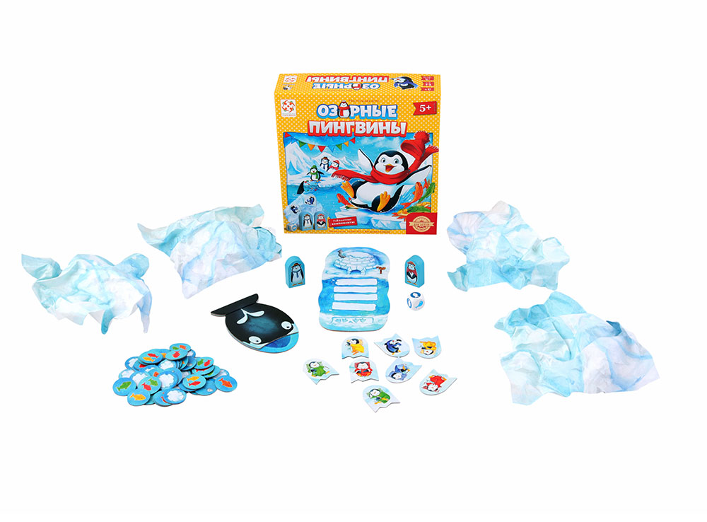 В состав настольной игры Озорные пингвины входят: 4 бумажных айсберга, 2 деревянные фигурки родителей-пингвинов, 8 жетонов с пингвинятами, 1 планшет, 48 жетонов с льдинками, 1 кит, 1 резинка, 1 кубик, правила игры.