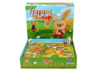 В состав настольной игры Удачливый кролик (Happy Bunny) входят: 1 игровое поле, 40 морковок (12 коротких, 10 средних, 18 длинных), 1 деревянная фигурка фермера, 1 деревянная фигурка кролика, 1 кубик с разноцветными гранями, правила игры на русском языке.