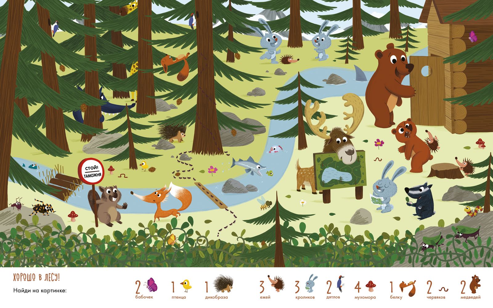 В лесу, в саванне, на полюсах, в горах, в деревне, в джунглях, в океане и даже в городе живёт много интересных и очень забавных животных! Рассматривайте их, считайте, ищите на рисунках ответы на несложные вопросы и задания, придумывайте истории на основе красочных картинок, а также играйте в веселую игру «Найди и покажи».