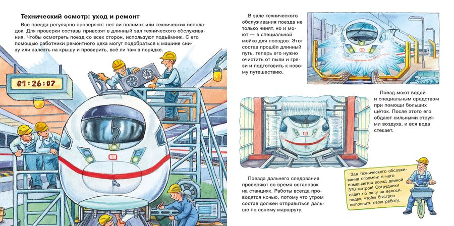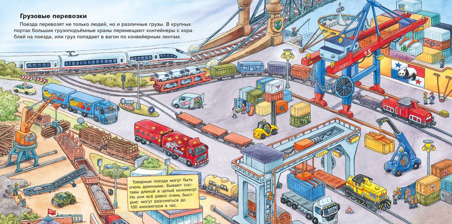 На каждом книжном развороте внимание Вашего малыша привлекут красочные тщательно прорисованные сюжетные изображения всех этапов, связанных с путешествием на поезде. Они расскажут не только об устройстве вокзала, железнодорожных путей и скоростного пассажирского поезда, но и о подготовке подвижного состава к поездке, о многочисленных видах профессий на железной дороге, об особенностях ремонта и технического обслуживания грузовых и пассажирских перевозок, о правилах поведения во время поездки и, конечно же, о самом путешествии.