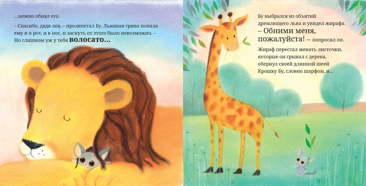 Наступило утро. Все звери в зоопарке либо проснулись, либо пробуждаются, и только Крошка Бу, детёныш маленького африканского зверька галаго, собирается... ложиться спать. Ведь он ночной зверёк - значит, спит днём, а бодрствует ночью. Перед сном мама всегда обнимает его, но сегодня мамы рядом не оказалось, и Крошка Бу решил отправиться на поиски того, кто сможет обнять его и приласкать. Кто это будет? Может быть, кенгуру? Или крокодил?! Кто знает...