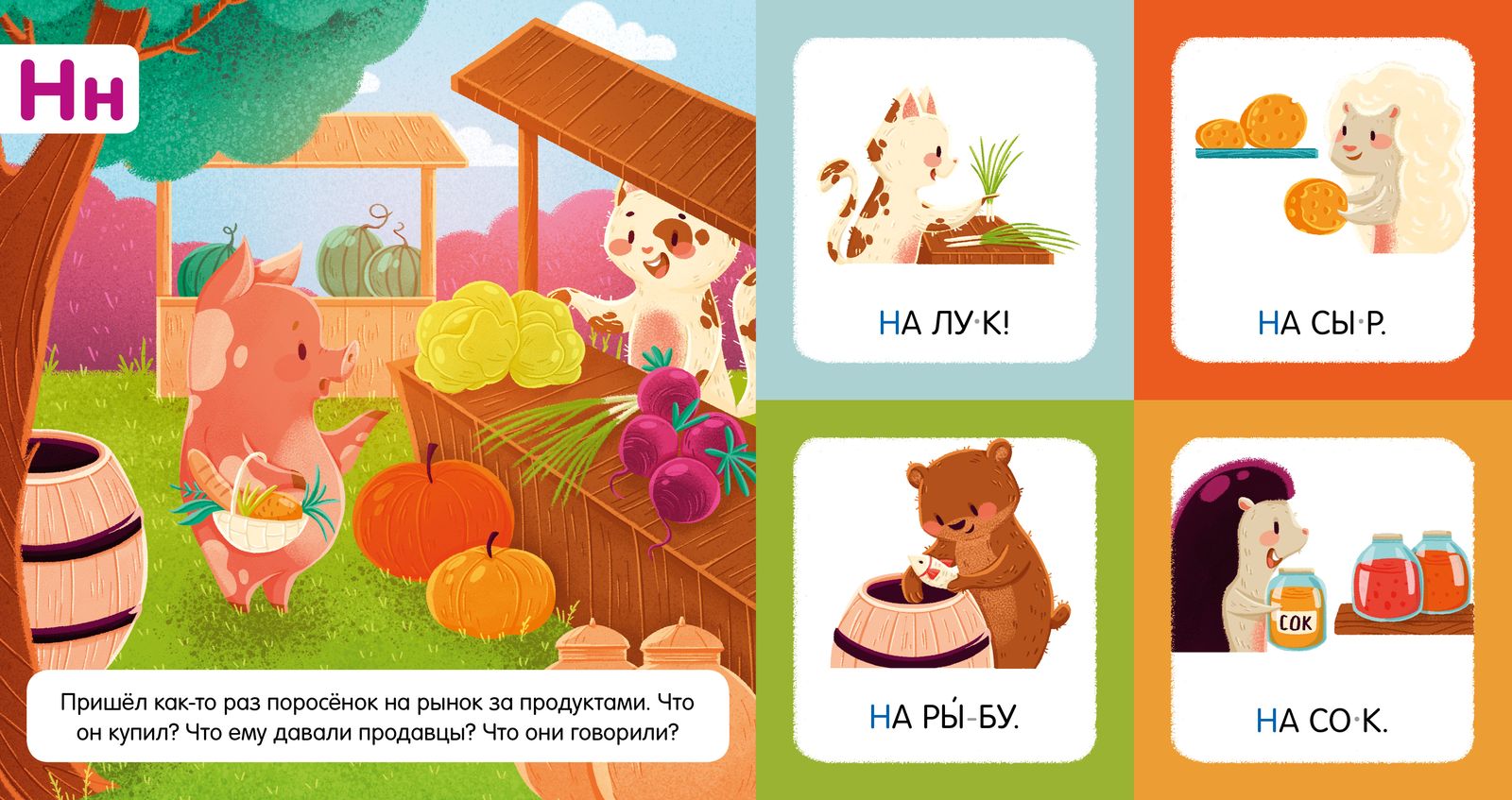 Перед изучением буквы взрослому предлагается прочесть сказку (этот текст расположен возле сюжетной иллюстрации слева на каждой странице), а справа расположены 4 яркие картинки со словами, которые ребенок легко прочтет сам.