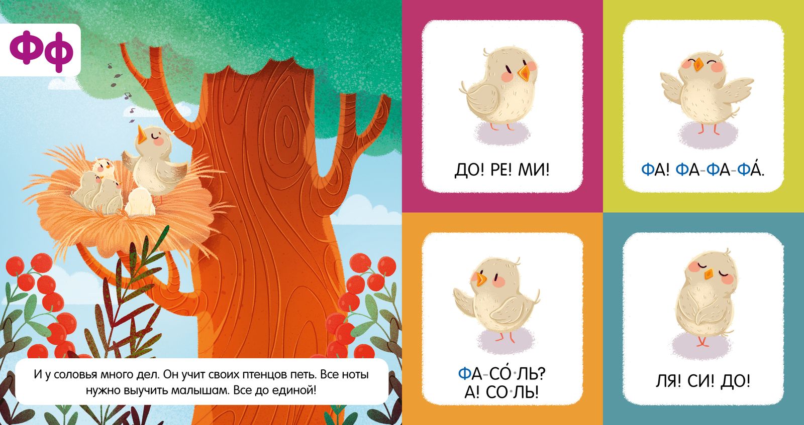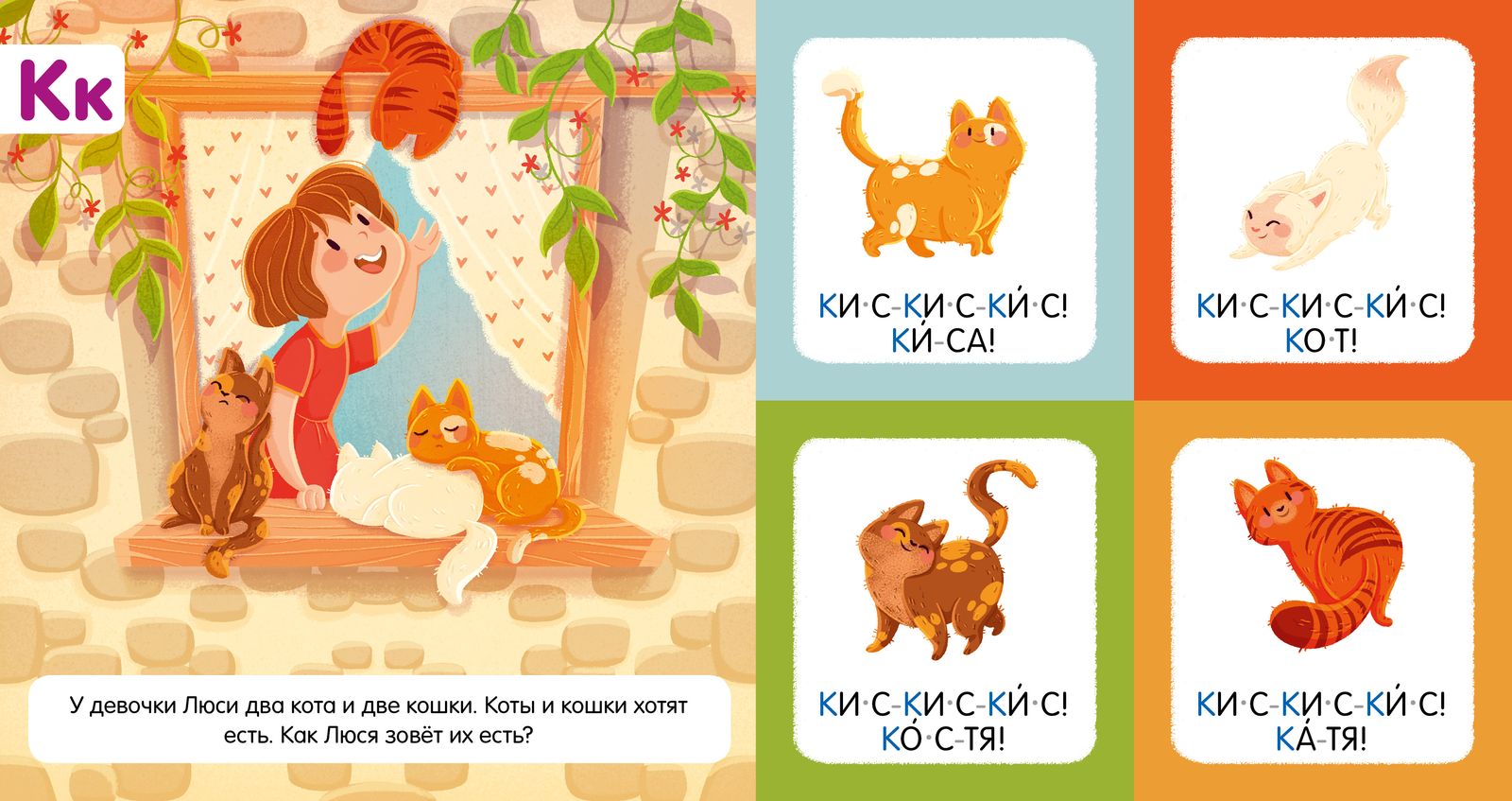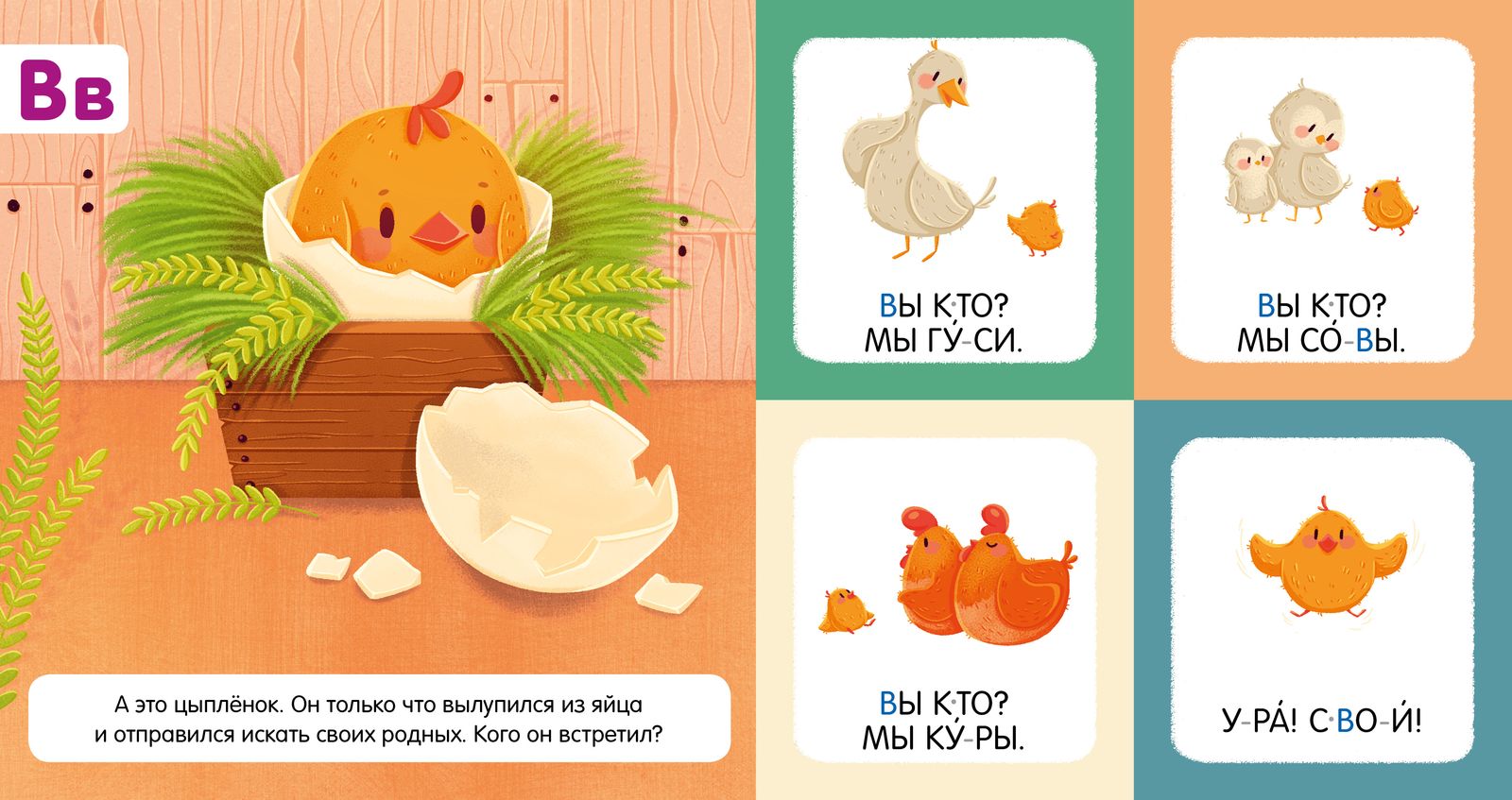 Перед изучением буквы взрослому предлагается прочесть сказку (этот текст расположен возле сюжетной иллюстрации слева на каждой странице), а справа расположены 4 яркие картинки со словами, которые ребенок легко прочтет сам.