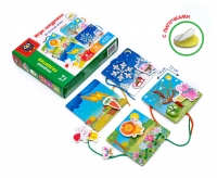 - Игровые атрибуты выполнены в виде 4 основ с изображением пейзажа разного времени года с отверстиями для шнурка, 8 деталями для крепления и 16 фигурными липучками.
