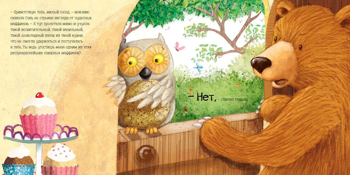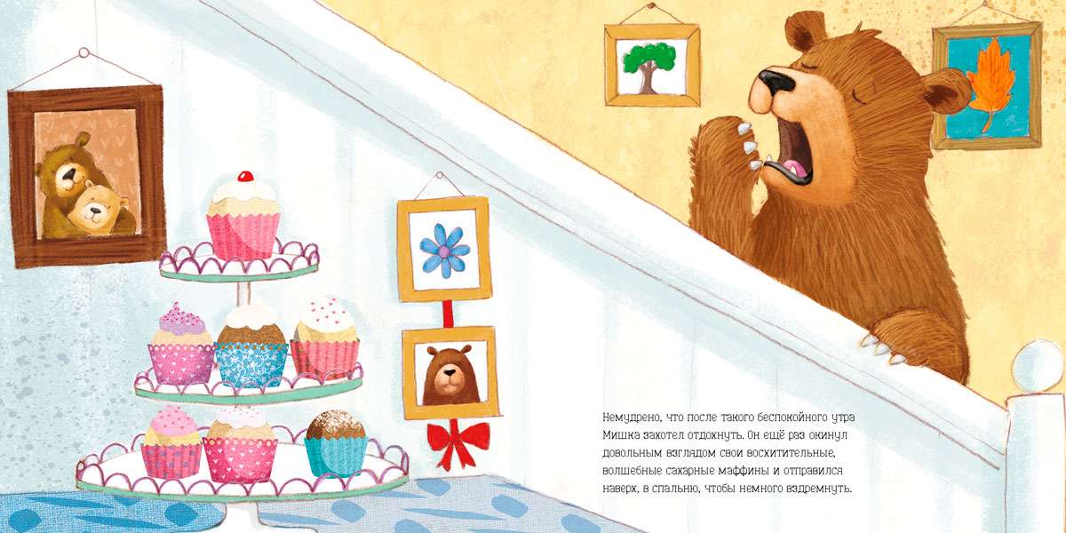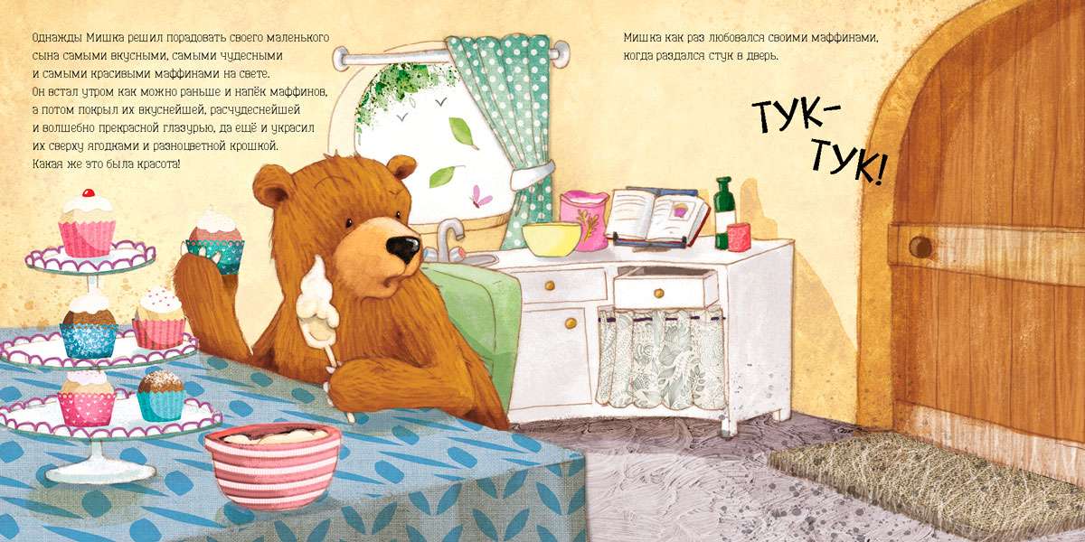 Однажды папа Мишка решил порадовать своего сына сахарными маффинами. Он встал пораньше, напёк маффинов и украсил их восхитительной сахарной глазурью. М-м! На аромат вкуснейших кексов стали приходить соседи: "Не дашь ли ты, Мишка, мне один такой маффин?" -- спрашивали они. "Нет!" --отвечал суровый медведь. Усталый, он прилёг отдохнуть, а когда проснулся... конечно же, чудные маффины исчезли! Что же случилось, что теперь делать?