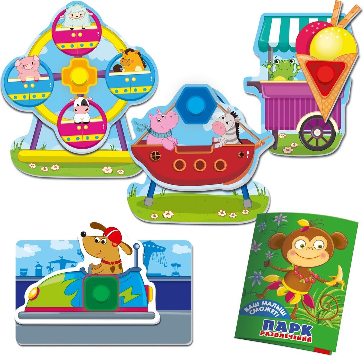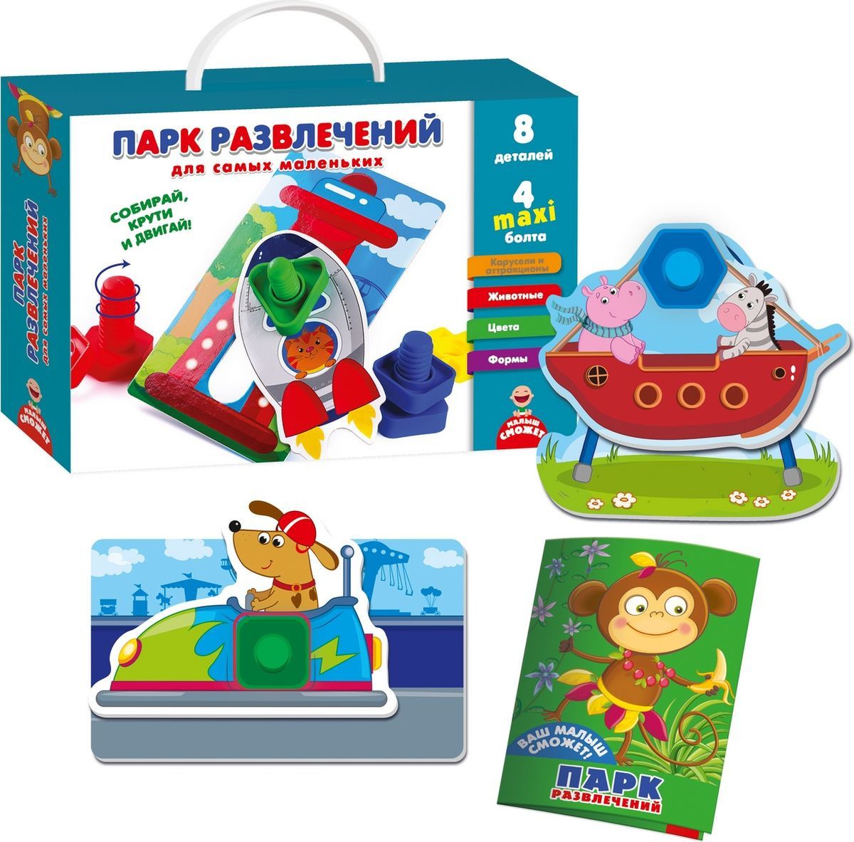 Увлекательная игра от компании «Vladi Toys» приглашает малышам посетить аттракцион со зверушками. Рассадить их по каруселям и соединить картонные фигурки болтами, чтобы они качались. Парк развлечений ждет деток, даря им позитивные эмоции и хорошее настроение.