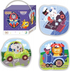 - Пазл представлен 18 элементами, из которых дети смогут собрать 6 отдельных картинок с изображениями транспортных средств.