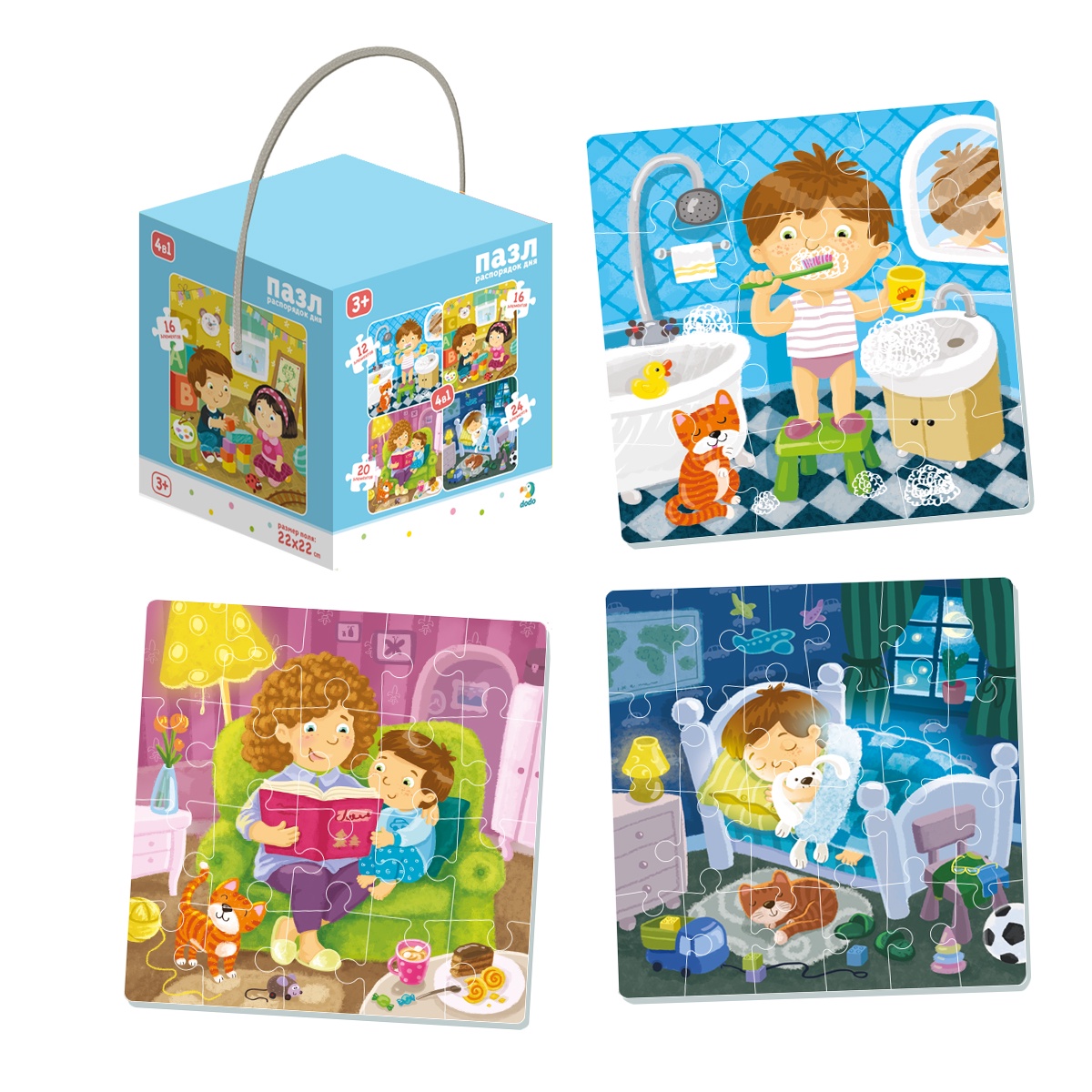 Оригинальный набор с 4 пазлами от компании «Dodo» разнообразит досуг малыша, познакомит его с распорядком дня. Каждая из сюжетных картинок состоит из разного количества элементов, поэтому ребенок сможет сначала выполнить простую задачу, а затем головоломка будет усложняться, стимулируя интерес ребенка к занятию.