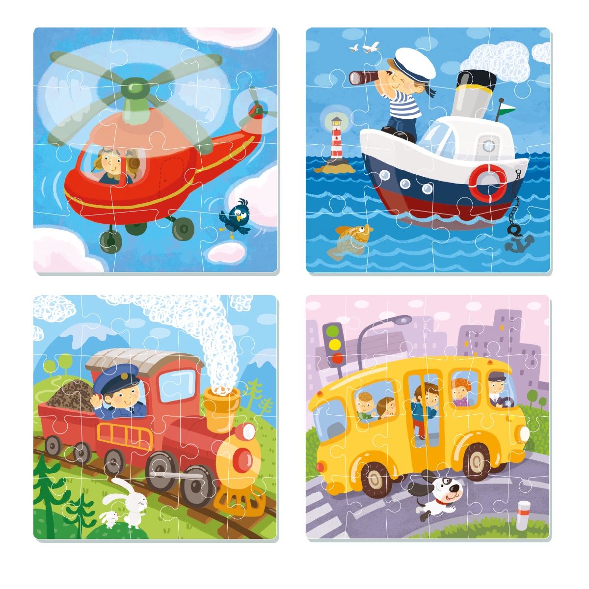 Замечательный набор от компании «Dodo» представлен 72 катонными деталями, из которых ребенок с увлечением будет собирать красочные картинки с изображением разного вида транспорта. Причем задача будет усложняться, ведь пазлы собираются из разного количества фрагментов.