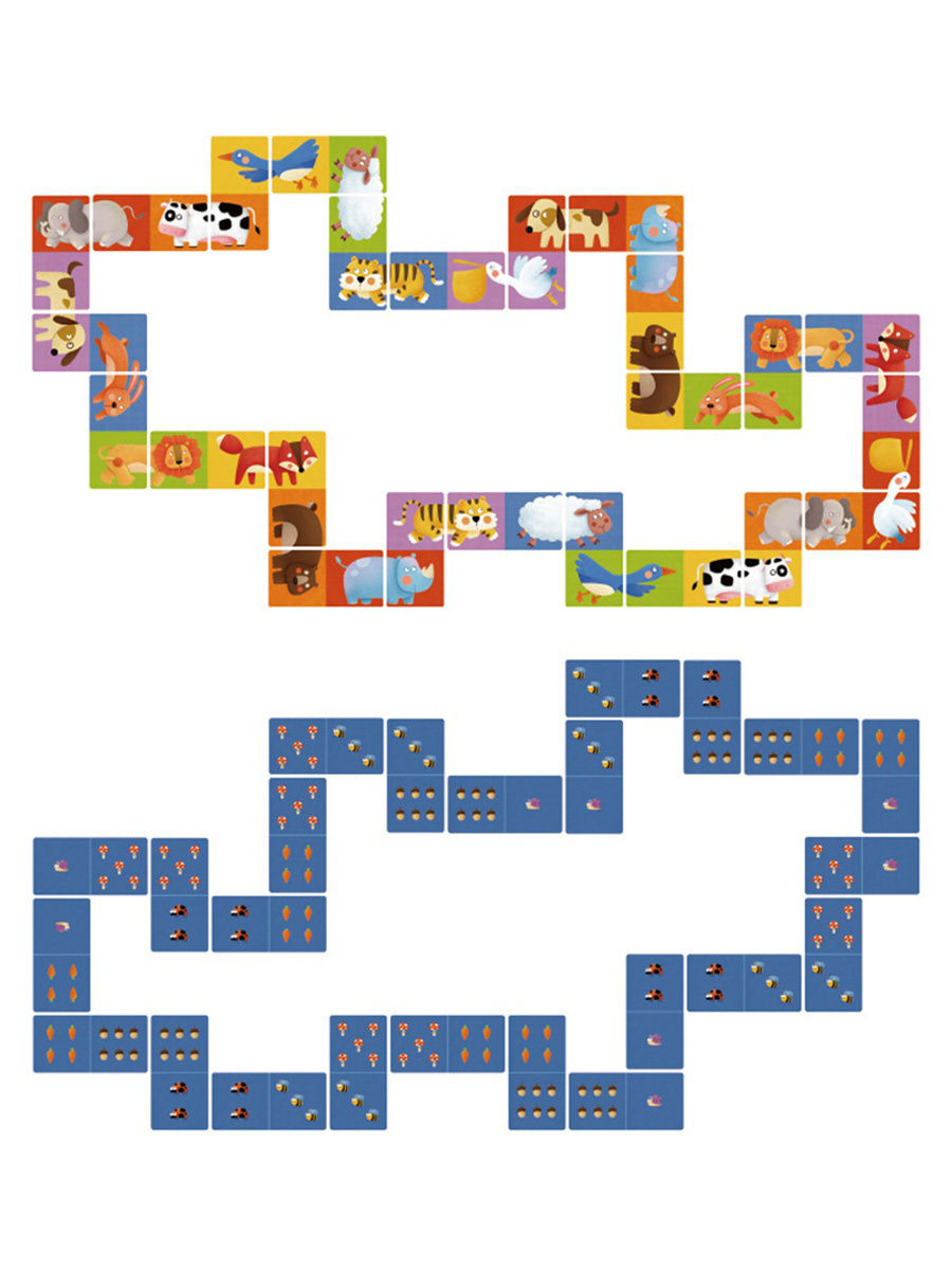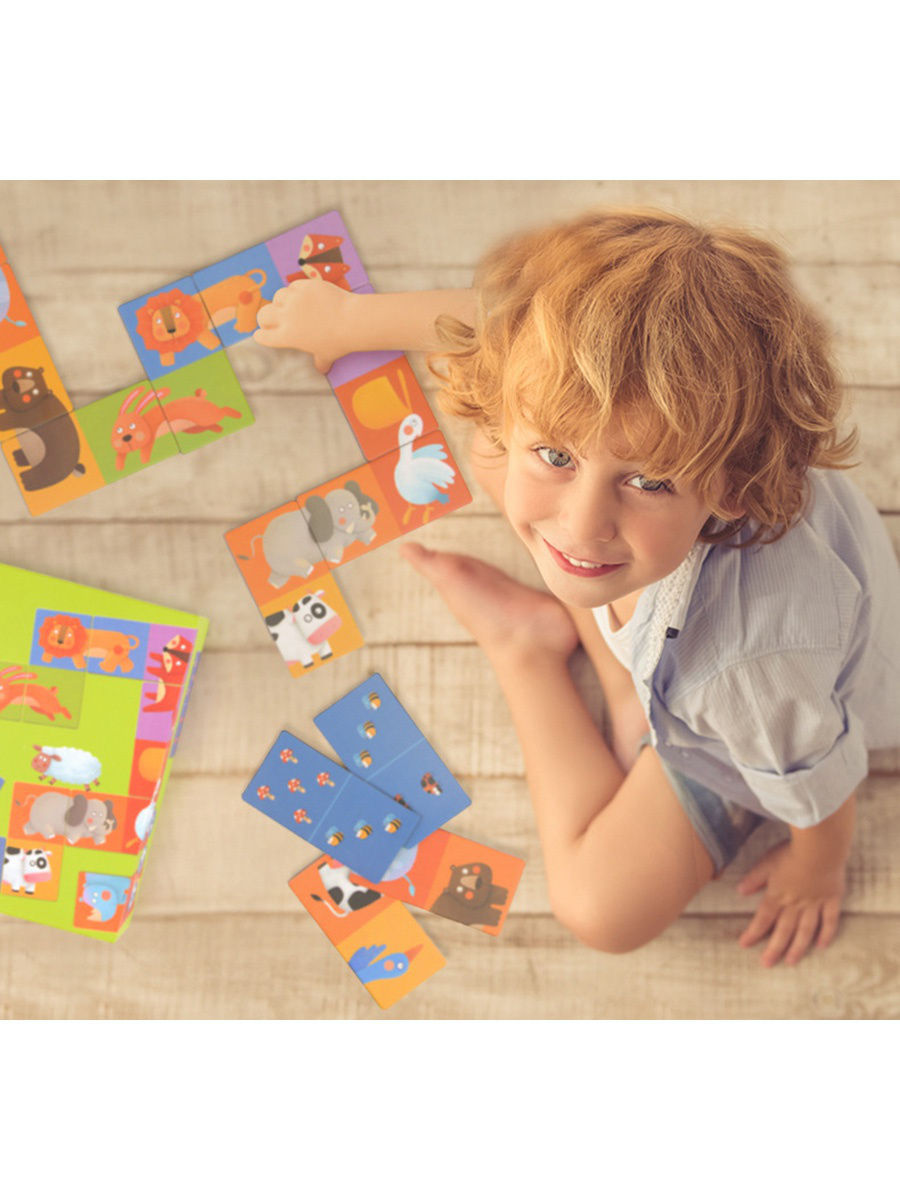 Пазл-домино "Животные" от компании MiDeer состоит из 24 двусторонних ярких карточек, с одной стороны карточки выглядят как всем нам привычное домино с разным количеством насекомых, мухоморов, желудей и т.д., а с другой стороны изображены забавные картинки животных. Игра начинается с того, что каждому игроку раздается по 6 карточек. Далее игроки последовательно должны выложить карточки со второй частью изображения животных или точек. Забавные изображения животных - слона, коровы, зайца, льва, и многих других - порадуют малыша и сделают игру интереснее. Игра прекрасно развивает смекалку ребенка, внимательность и моторику. Учит его усидчивости, счету, логическому мышлению.