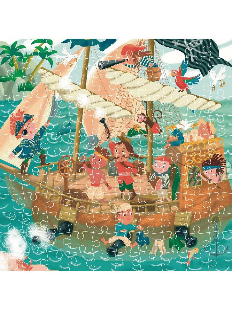 - Пазл представлен 120 картонными элементами, которые собираются в красочную картинку с изображением пиратского корабля.