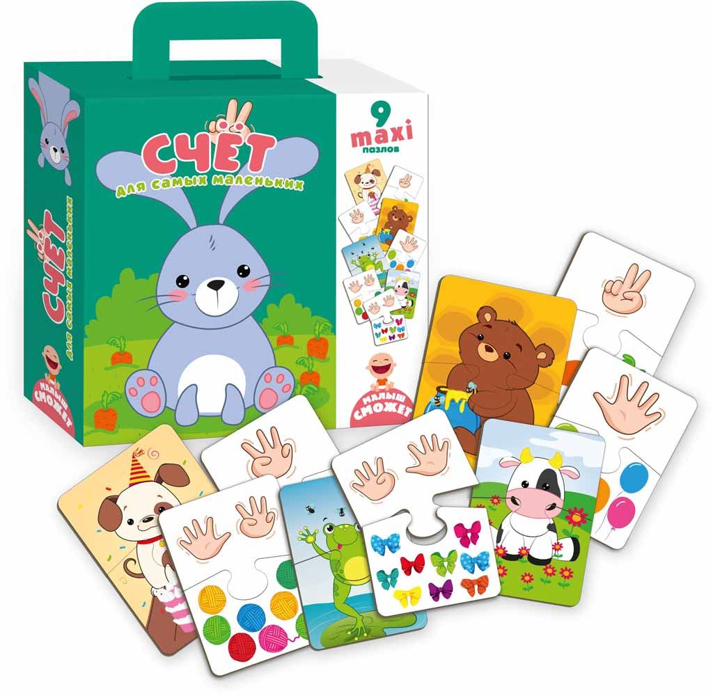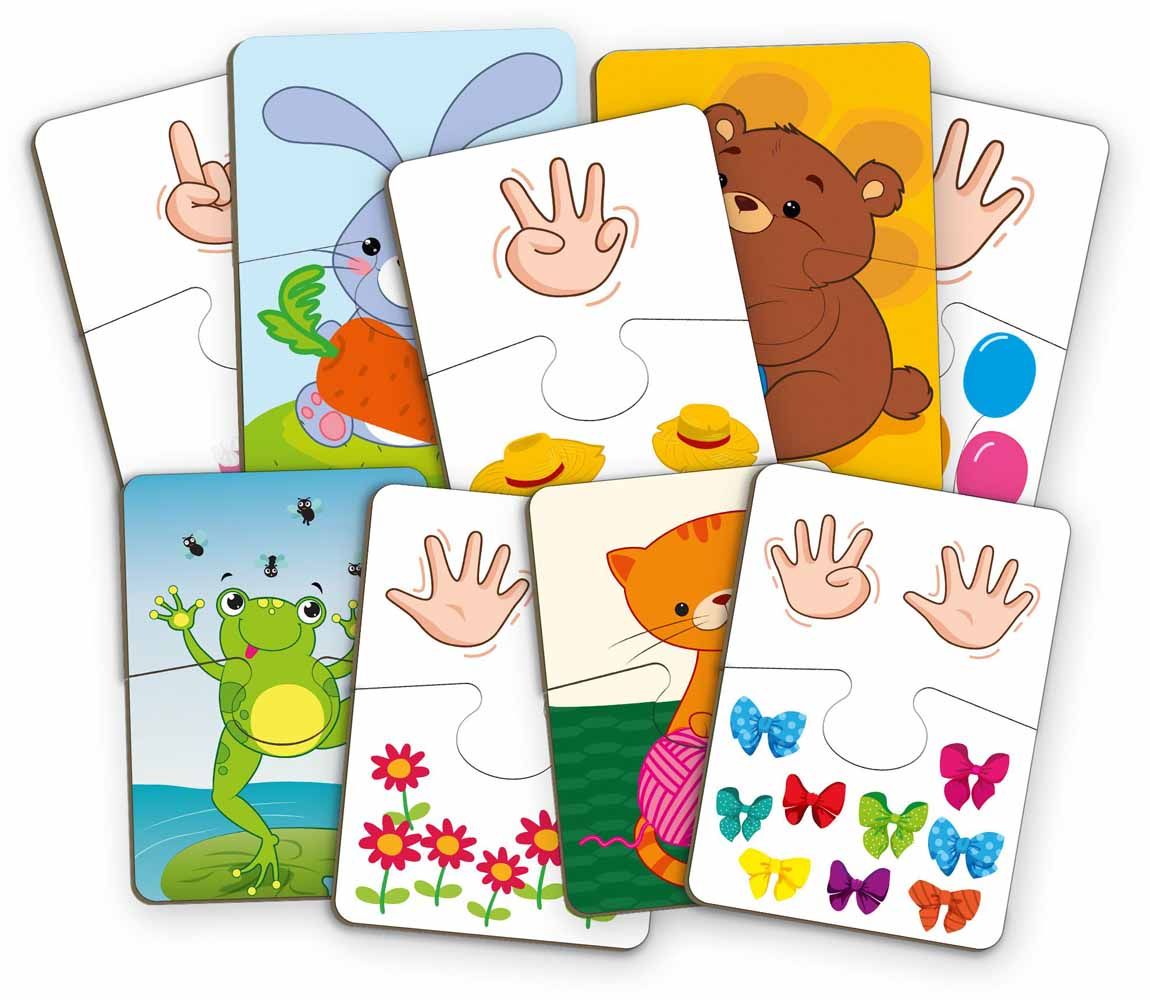 Пазлы-двойняшки «Счет» от компании «Vladi Toys» увлекательная игра для малышей, в процессе которой декам предлагается собрать пазлы из 2х половинок. На одной изображены предметы в определенном количестве, на другой половинке цифры, обозначающие количество предметов.