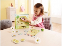Для игры установите улей вертикально, а цветы разложите возле баночки с медом. Бросив кубик, малыш помогает пчелке найти цветок такого же цвета и отнести его в улей. Веселый механизм улья, при котором брошенный внутрь цветок выпадает снизу капелькой меда, приводит детей в восторг :)
