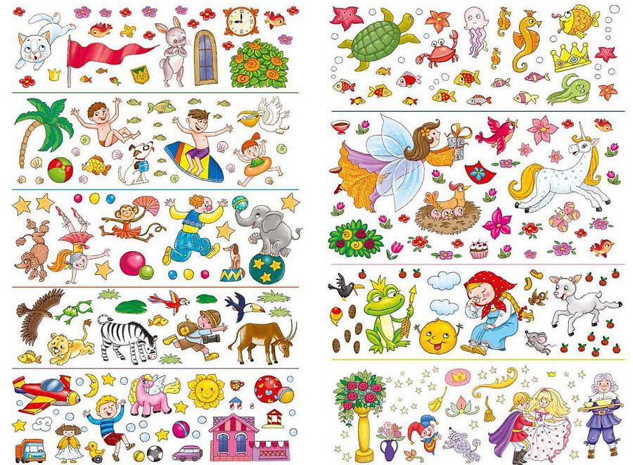 - 9 ярких тематических разворотов с интересными сюжетами и более 260 переводных картинок.