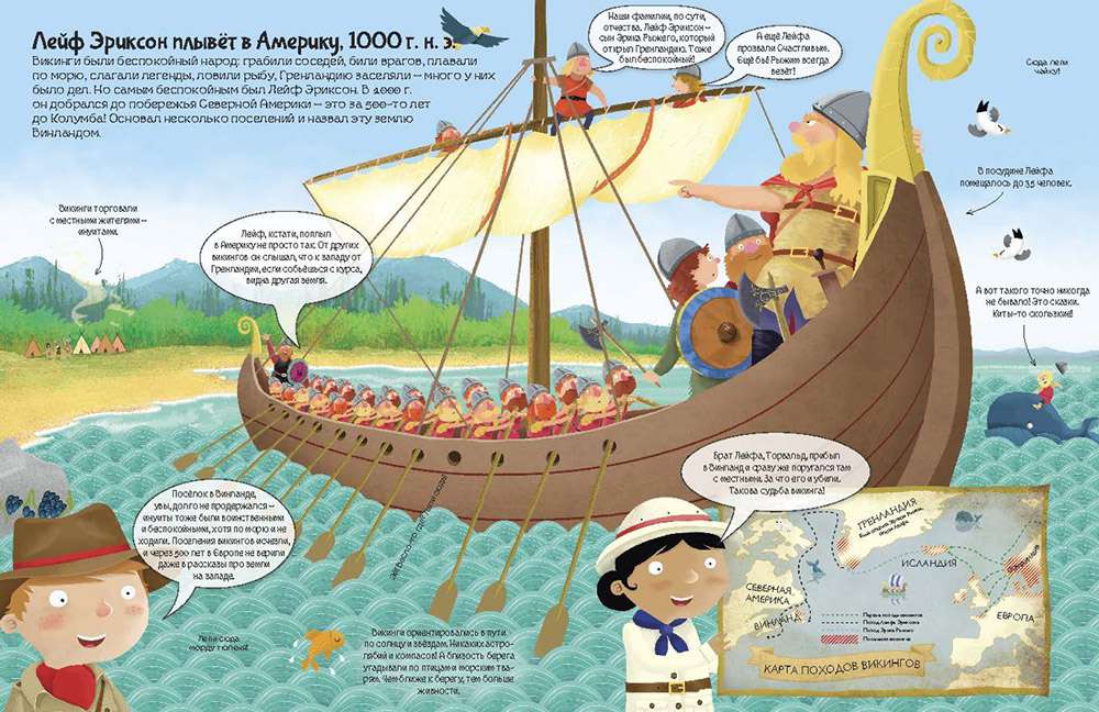 Яркая книга с веселыми текстами и наклейками об открытиях стран и целых континентов! Как насчёт того, чтобы пойти в поход с Александром Македонским? Или забраться на Эверест, который на самом деле Джомолунгма?