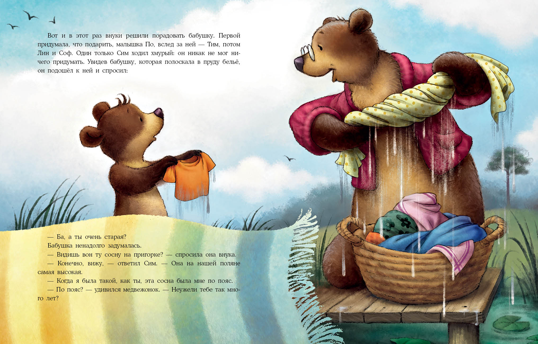 Медвежата очень любят свою бабушку. На день рождения они всегда готовят ей в подарок что-нибудь чудесное! Но в этот раз медвежонок Сим озадачен: бабушке много лет, а значит, ей уже дарили и лесной мёд, и цветы, и варенье. Чем же её удивить? И Сим отправляется в путешествие, чтобы найти самый необычный подарок для бабушки?