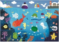 Все детали пазла выполнены из качественного многослойного картона, что делает их прочными и стойкими для долгой игры малыша. В комплект входит 24 большие основные детали и 8 деталей в виде морских обитателей.